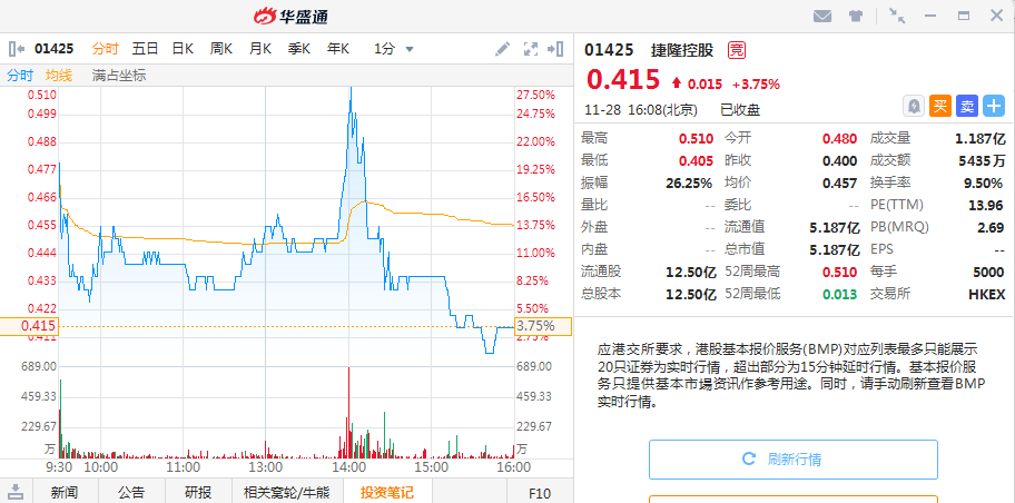 捷隆控股收涨3.75%,报价0.415港元,若以发行价买入,一手赚75港元,成交额5435万港元 ,最新市值5.187亿港元。