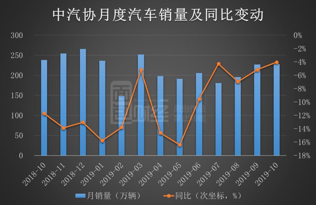 中汽协数据显示,2019年10月汽车销量228.4万辆,环比上月增长0.6%,同比下降4%;1-10月,汽车累计销量2065.2万辆,同比下滑9.7%。