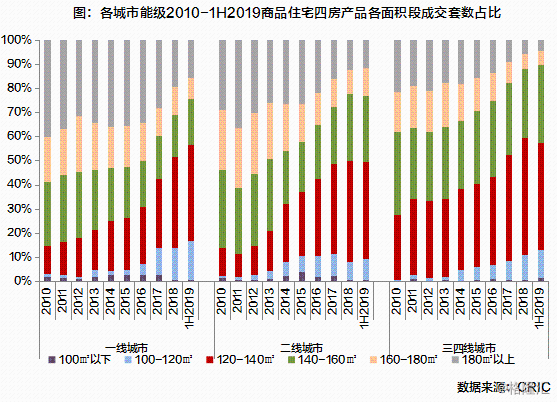 另外,今年上半年100-120㎡四房产品成交稳中有升,占比较2018年增加1.6个百分点至8.9%。而180㎡以上大面积段四房产品成交占比延续下滑趋势。