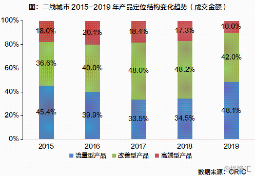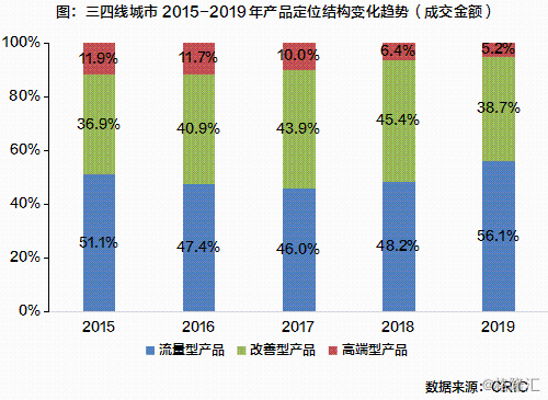 二线城市:九成市场份额集中在流量型产品市场和改善型产品市场。2019年二线城市的产品结构由2:5:3的水滴形格局演变为1:4:5梨形格局,其中,高端型产品和改善型产品成交额占比分别下滑7.3、6.2个百分点,流量型产品市场显著增强,占比达48.1%。