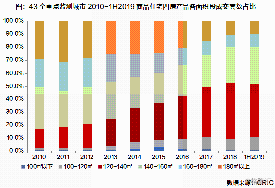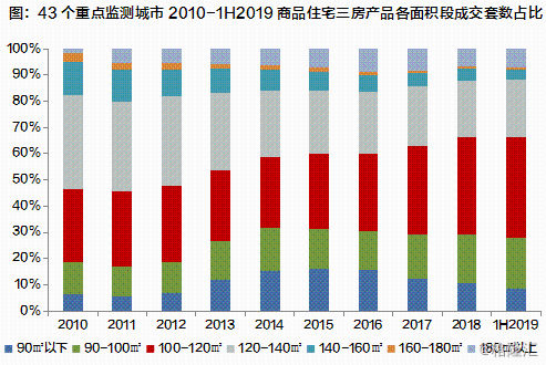 从43个重点监测城市(4个一线城市,24个二线城市及15个三四线城市)近十年各房型成交套数比重分布来看: