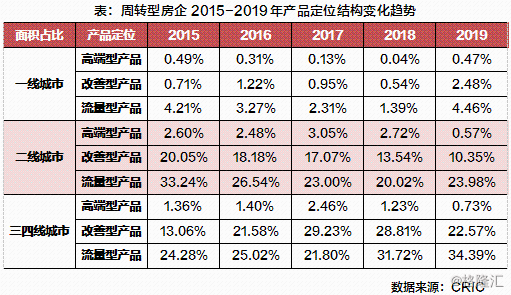 从数据结构来看,2019年周转型房企仍以三四线城市流量型和改善型市场为主,成交面积占比达57%,且各能级流量型产品市场均有所加强。