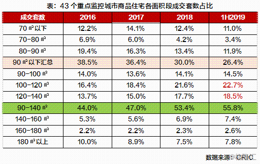 100-140㎡住宅产品成交集中,备受现阶段购房者青睐。43个重点监测城市商品住宅面积段成交数据显示,近年商品住宅成交面积段逐渐向100-140㎡集中。