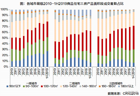 今年上半年,三四线城市90-120㎡三房成交占比高达65.3%,其中100-120㎡三房是绝对成交主力,成交超过40.0%,90-100㎡三房产品成交占比增幅最大,较2018年增加2.8个百分点至23.7%。