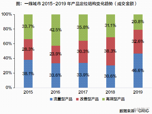 从今年的统计数据来看,各能级城市产品结构变动较为一致,总体向流量型产品下沉,流量型及改善型产品占据市场主体地位,而高端型产品成交比重明显回落。
