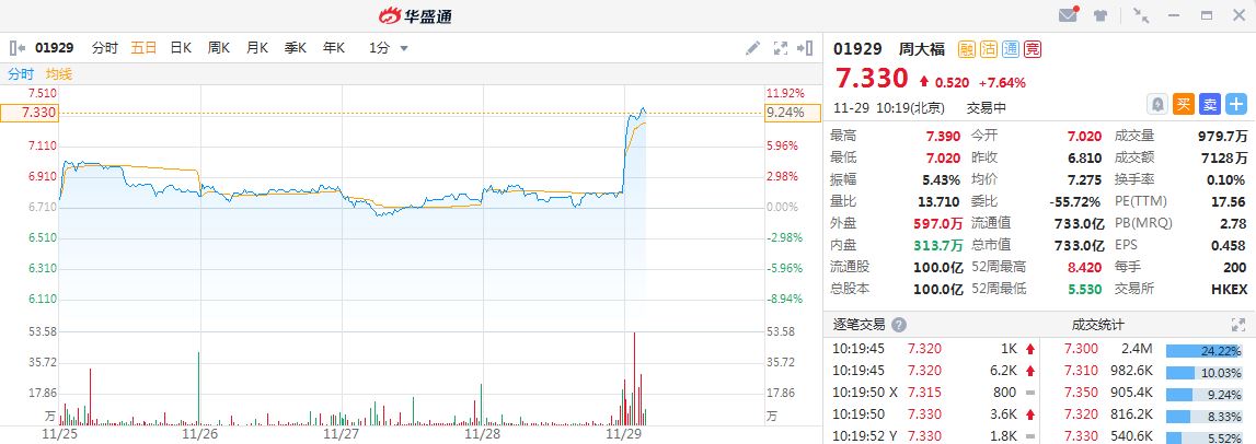 周大福(1929.HK)盘初大幅拉升上涨,现大涨7.64%,报7.33港元,暂成交7128万港元,最新总市值733亿港元。