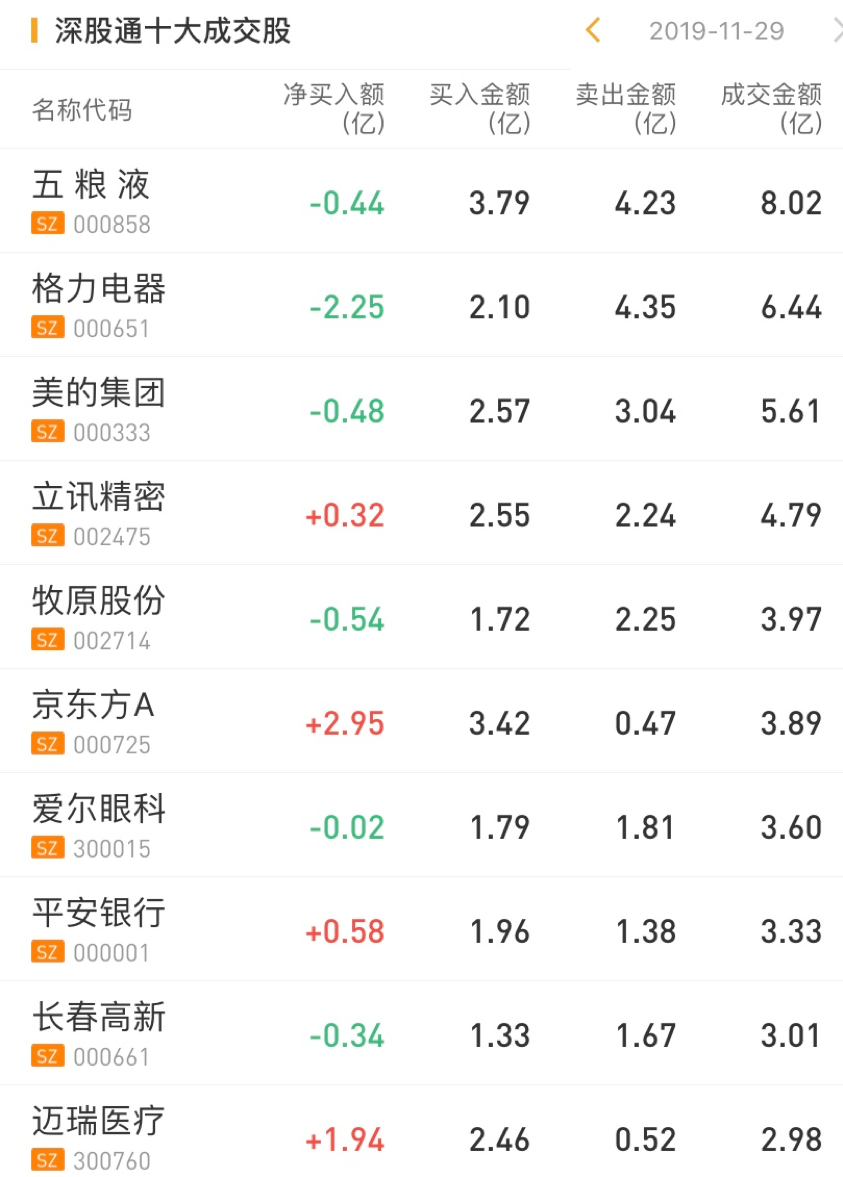 深股通净卖出五粮液0.44亿元,净卖出格力电器2.25亿元,;净买入立讯精密0.32亿元,净买入京东方A2.95亿元。