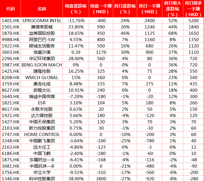 其中一手收益排名靠前的有SPROCOMM INTEL、康德莱医械、益美国际、阿里巴巴、银城生活服务、信基沙溪、华记环球等,一手收益均在720港元以上。