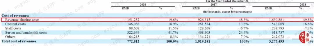 虽然服务器和带宽成本在2015年至2018年的数值一直在稳步飙升,从2015年的1.77亿元,2016年的3.23亿元,2017年的4.69亿元到2018年的6.19亿元。但其占总营业成本的比重却逐步降低,2018年只有18.9%,已经难以构成成本中的主要部分了。