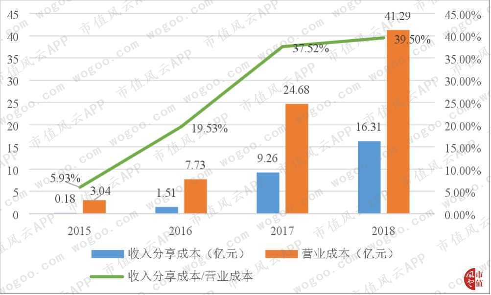 虽然内容成本从2016年的1.46亿元、2017年的2.62亿元,增加到2018年的5.43亿元,近乎每年要翻将近一倍,但内容成本占营业成本的比例却从2016年的18.90%、2017年的13.60%,降到2018年的16.60%,占比越来越低。