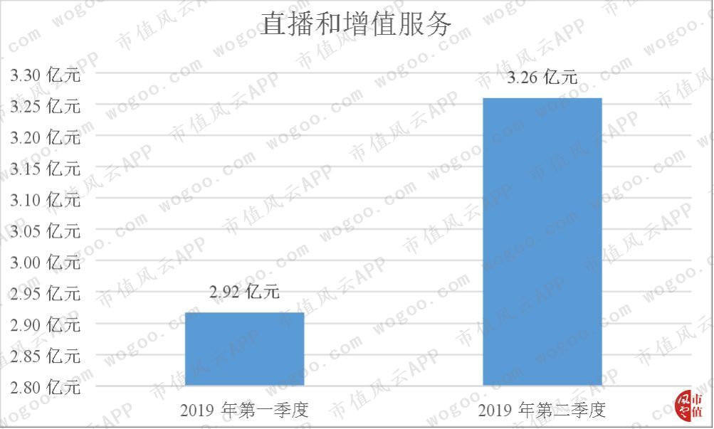 2019年第二季度直播和增值服务业务营业收入3.26亿元,较2018年同期增长175%,较2019年第一季度环比增长11.76%。