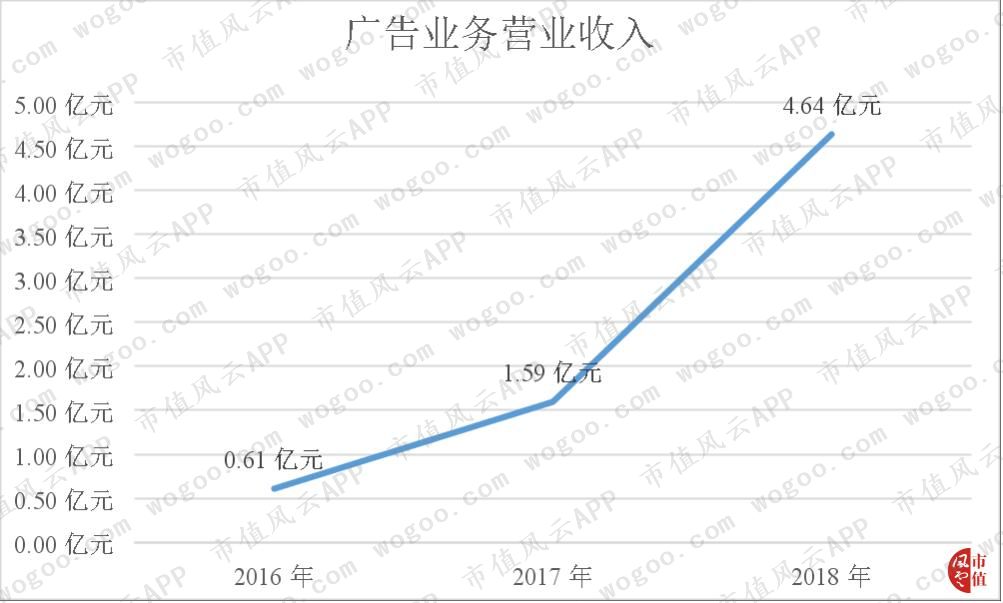 图中可以看出,B站的广告业务营业收入从2016年的0.61亿元增长到次年的1.59亿元,后自2017年增长191.14%至2018年的4.64亿元。其中2017年的高增速是因为B站在此期间引入了feed广告服务(在发布的消息之间插入的一种广告形式)。