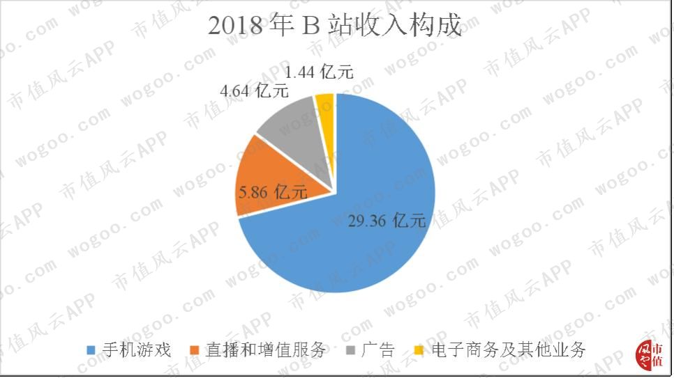 从最近的2018年年报看,B站收入主要来自于占比71.11%的游戏业务,其次为占比14.18%的直播和增值服务业务,之后是占比11.23%的广告业务和占比3.48%的电子商务及其他业务。