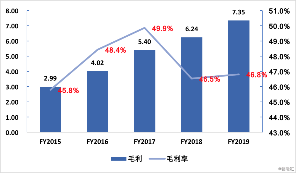 公司FY2019实现毛利7.35亿元,毛利率为46.8%,与去年基本持平。