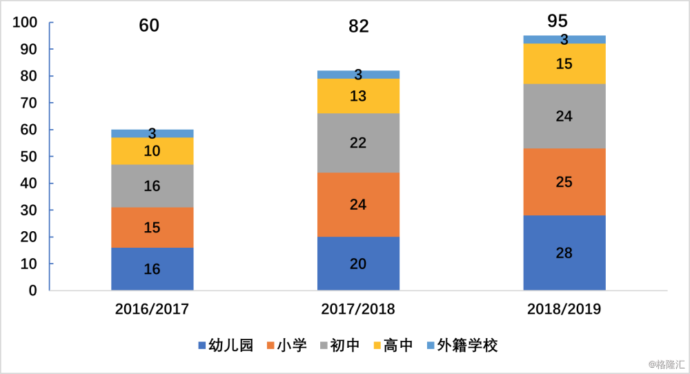 图:2016/2017~2018/2019枫叶教育各阶段学校数量