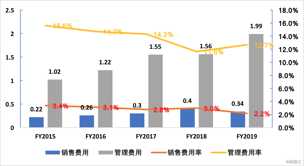 公司2019财年销售费用为0.34亿元,销售费用率为2.2%,同比下降0.8pct。管理费用为1.99亿元,管理费用率为12.7%,同比上涨1.1pct。期间费用率基本稳定。