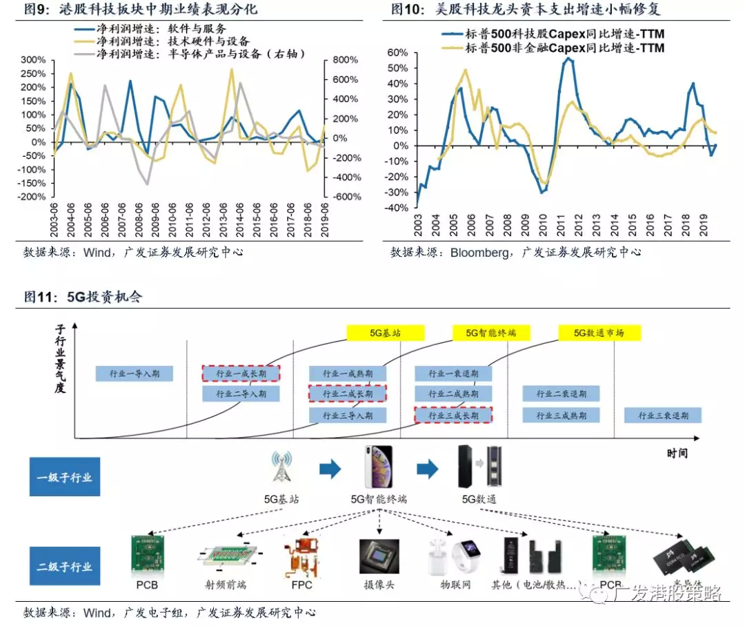 2019年,在基本面和产业逻辑预期反转的背景下,港股科技龙头获得可观涨幅。从细分板块的19年中期业绩来看,技术硬件与设备、软件与服务行业盈利增速底部反弹,半导体产品与设备则继续回落;从股价表现来看,代表“硬科技”的技术硬件龙头个股表现突出,而代表“软服务”的互联网、软件服务相对平淡。