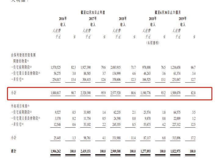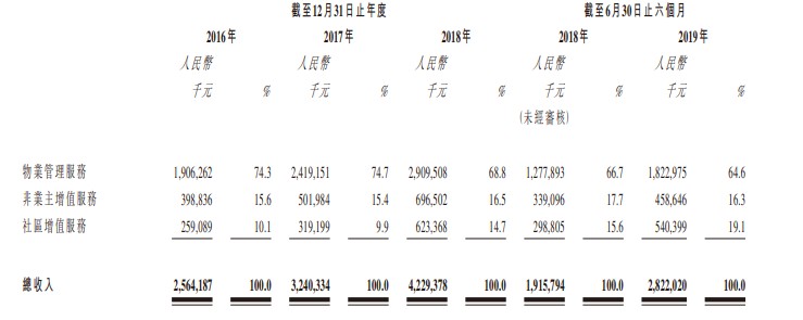 目前保利物业共有三个业务条线,分别提供物业管理业务、非业主增值服务及社区增值服务,其中物业管理业务是该公司最重要的收入来源。招股书显示,保利物业2019年前6月物业管理业务收入占总营收的比例接近65%。