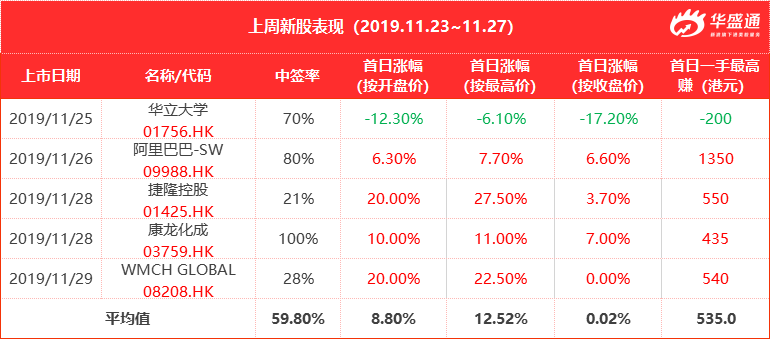 华立大学首日破发成上周最弱新股,阿里上市没有辜负剁手族的期望成上周最强新股,康龙化成中签率100%,对比A股折价高达35%诚意满满,还有中签率低但首日大涨的捷隆控股和字母股WMCH GLOBAL。