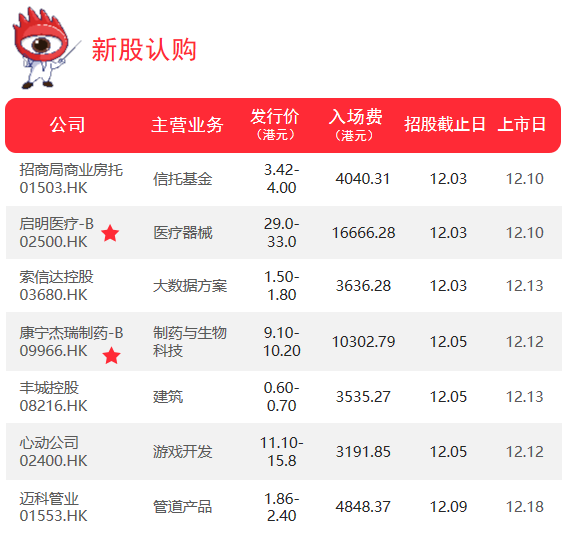 接班启明医疗班是今日开始招股的康宁杰瑞,招股价9.1-10.2港元,发行1.794亿新股,集资16.33-18.3亿港元,每手1000股,入场费10302.79港元。引入7名基石投资者,包括清池资本、奥博资本、景林、泰康等,认购1.33亿美元,以中间价计算,相当于发售股份的57%,有6个月禁售期。