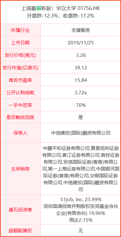 上周唯一一只首日破发的新股,华立大学是华南领先的大型民办高等教育及职业教育集团,在华南地区所有民办职业教育服务供应商中排名第二,在华南地区所有民办高等教育服务供应商中排名第四。
