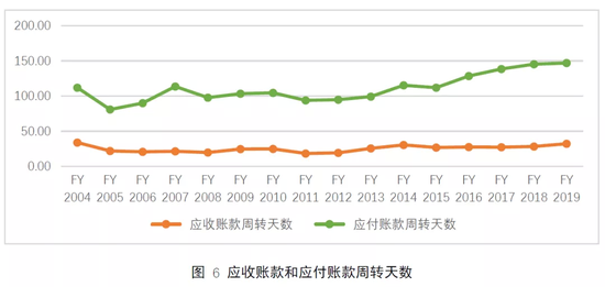 较少的供应商,有利于苹果公司对供应商采取标准化的管理。同时较少的供应商还可以使苹果确保每一类产品的都有巨额的采购需求,提高了苹果对上游供应商的议价能力。苹果对关键零部件一般寻找两家左右的供应商,以避免供货风险,提高自身议价能力。如公司的手机由富士康代工,电脑则由鸿海精密代工。手机基带苹果选择了高通和英特尔两个厂商的方案。这些举措使苹果对供应商有着极强的议价能力。如图 6所示,苹果公司应收账款天数可以控制在40天以内,而应付账款周转天数则长达近140天。