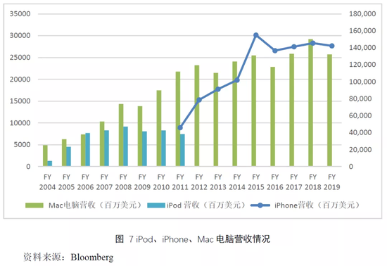 从收入结构看(图 1),iPhone手机依然是苹果公司最大的营收来源,由于苹果公司销售收入对手机业务的高度依赖,一旦手机销售不佳,苹果公司市值便会出现较大幅度的波动。