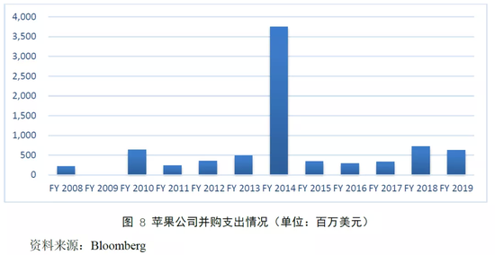 因此,苹果公司的研发策略是,收购具有应用前景的创业公司,将其技术改进,融入现有产品中;或者是收购产品的关键零部件厂商,减少对上游供应商的依赖,更加有效的控制成本。苹果公司并购支出的情况如图 8所示。2008年,苹果收购微处理器公司P.A. Semi,获得相关技术后,苹果推出了自主知识产权的A系列iPhone手机芯片,摆脱了对三星、高通等公司的依赖。2009年苹果收购Placebase地图软件公司,推出苹果地图与谷歌、微软相竞争。2014年,苹果收购耳机制造及音乐流媒体服务商Beats,其耳机直接作为产品并入苹果硬件产品线,其音乐服务则整合到iTunes中。