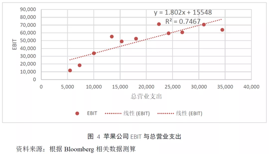 我们采用OLS回归分析,计算苹果公司EBIT与营业总支出的关系,如图 4所示,营业支出每增加1美元,苹果公司可获得1.82美元的息税前利润。