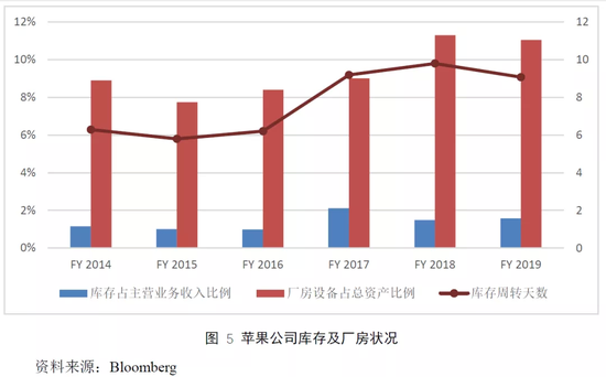 苹果公司的生产环节大部分由外包企业完成,苹果自身的厂房则专注于产品整合、研发以及高端产品的加工。苹果公司厂房设备占固定资产的比重长时间保持在10%以内(图 5),这对于苹果而言,意味着仍然有很大的产能提升空间,只要市场有需求,苹果可以继续大量供应产品,并保持较低的运营成本。