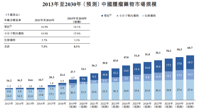 下图列示中国肿瘤药物市场于所示期间的历史及预测市场规模(按各类疗法的销售收入计)。按销售收入计算,中国肿瘤药物市场从2013年的162亿美元增至2018年的234亿美元,预计2030年将达到607亿美元,从2018年起计的年复合增长率为8.3%。单抗为增长最快的疗法类型,自2018年至2030年的年复合增长率为18.1%。