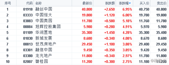 港股市场,融创中国大涨近7%,中国恒大上涨6%,中国奥园大涨5.18%,旭辉控股集团、华润置地、新城发展均大涨超过4%,碧桂园大涨2.75%。