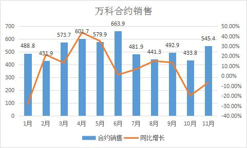 公告显示,于2019年11月份,万科实现合同销售面积364.5万平方米,同比增长2.5%,合同销售金额545.4亿元,同比减少6.48%。