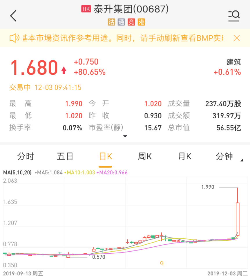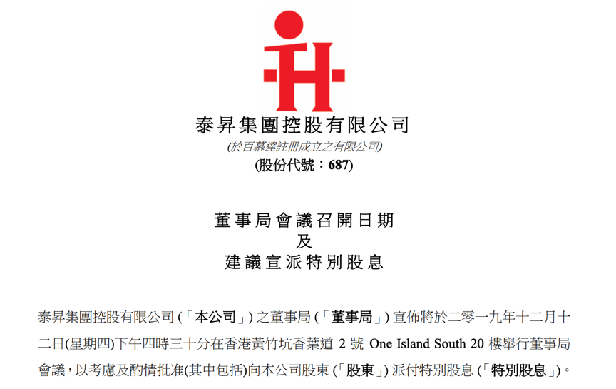 12月2日收盘后,泰升集团宣布,公司将于2019年12月12日在香港举行董事局会议,以考虑及酌情批准向公司股东派付特别股息。在董事局会议批准后,泰升集团将另行发布公告,以载列特别股息派发详情。值得注意的是,公司公告中表示董事局未必会批准建议特别股息的派发,因此股东及潜在投资者需要谨慎行事。