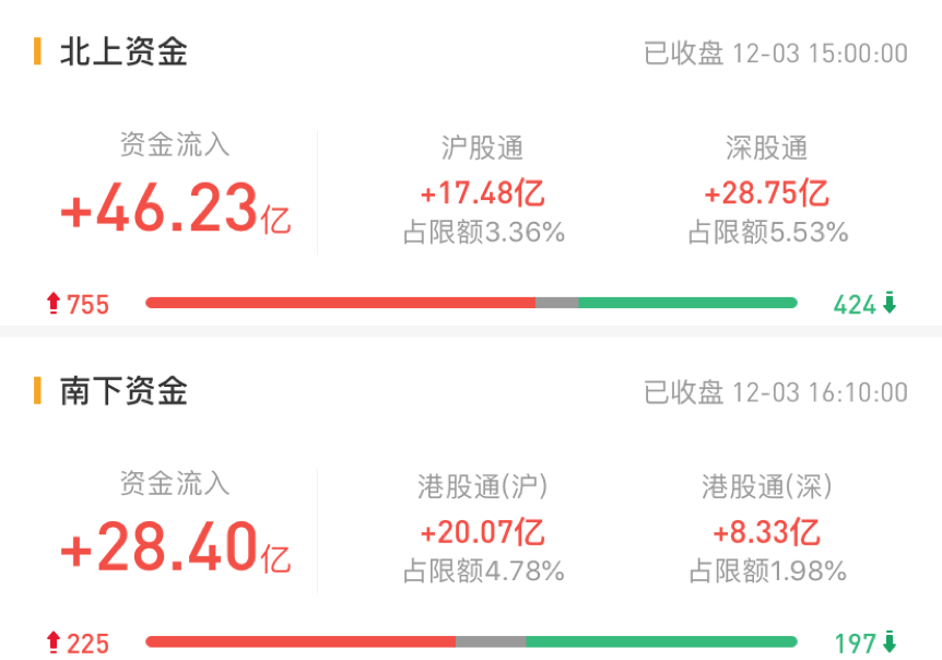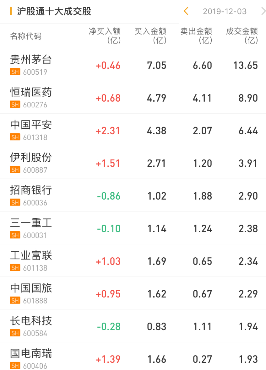 北上资金方面全天净流入46.23亿元。沪股通净买入贵州茅台0.46亿元,净买入恒瑞医药0.68亿元,净买入中国平安2.31亿元,净买入伊利股份1.51亿元。