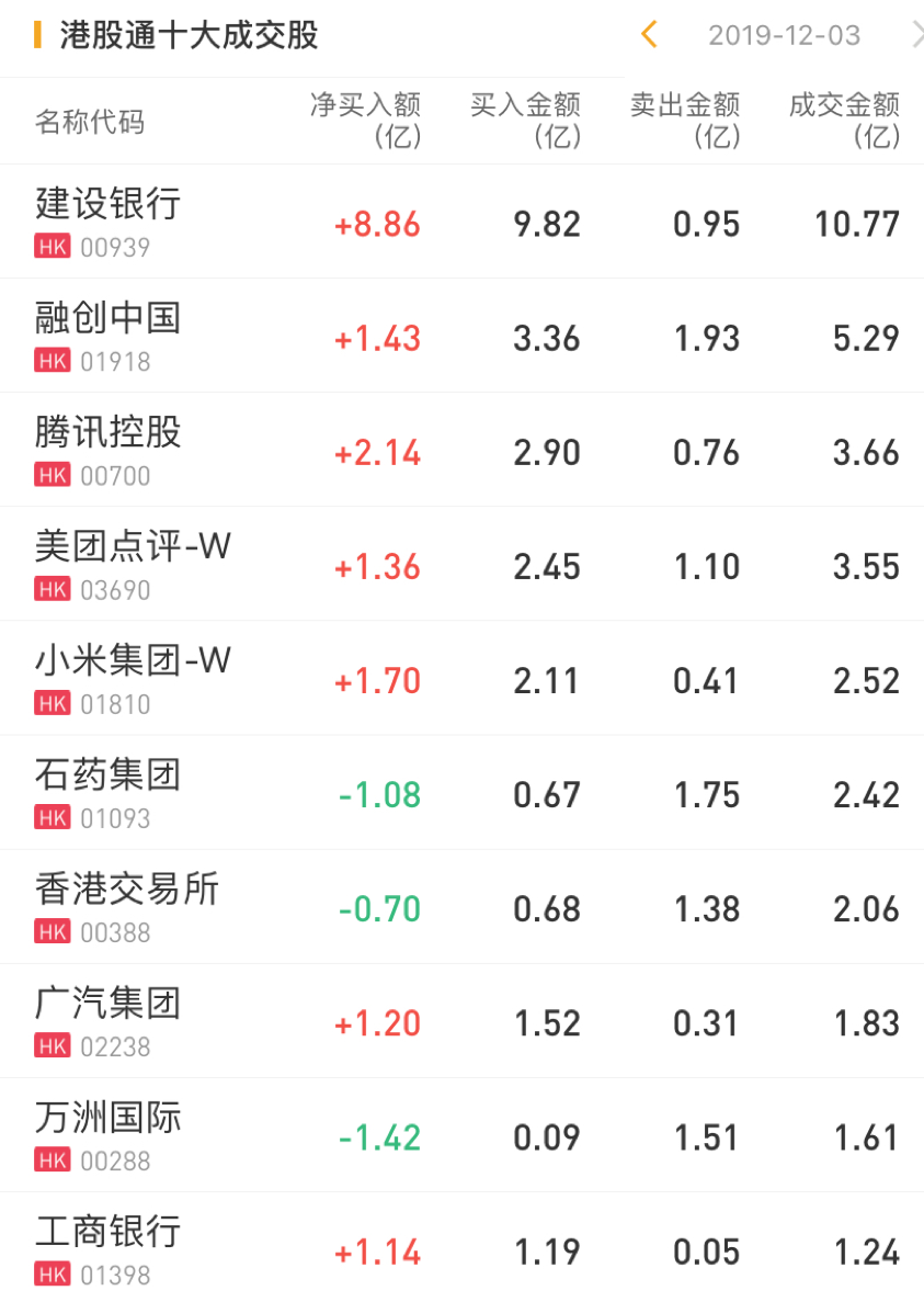 南下资金今日净流入港股28.40亿元。今日净买入建设银行8.86亿港元,净买入腾讯控股2.14亿港元,净买入融创中国1.43亿港元。