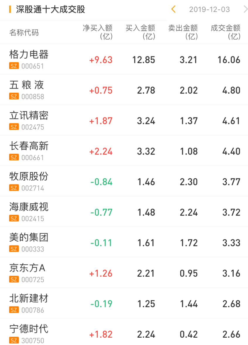 深股通净买入格力电器9.63亿元,净买入五粮液0.75亿元,净买入长春高新2.24亿元,;净卖出牧原股份0.84亿元。