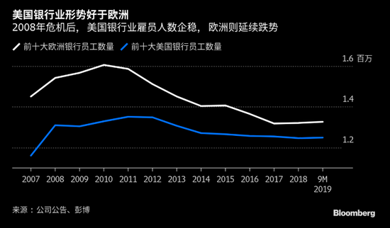 这一数字凸显了欧洲银行业的疲软,该地区出口导向型的经济受到国际贸易争端的冲击,而负利率也会进一步蚕食贷款收入。美国的政府项目和利率的上升帮助银行得以在金融危机后迅速复苏,而欧洲则不尽相同,银行仍然难以重新站稳脚跟。许多银行正在通过裁员和出售业务的方式提高利润。裕信银行表示,下一轮裁员将把总开支降低10亿欧元(11.1亿美元)。