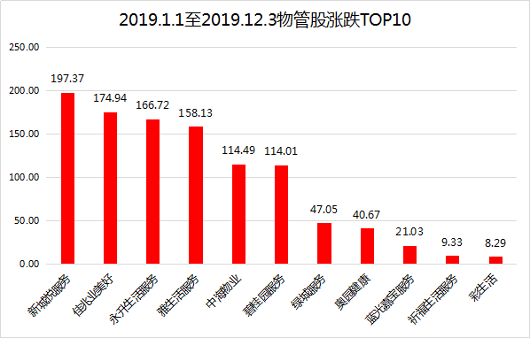 将港股上市的物业管理股2019年1月1日至12月3日的涨跌幅做一个排序,可以看到涨幅在100%以上的公司有6家之多。