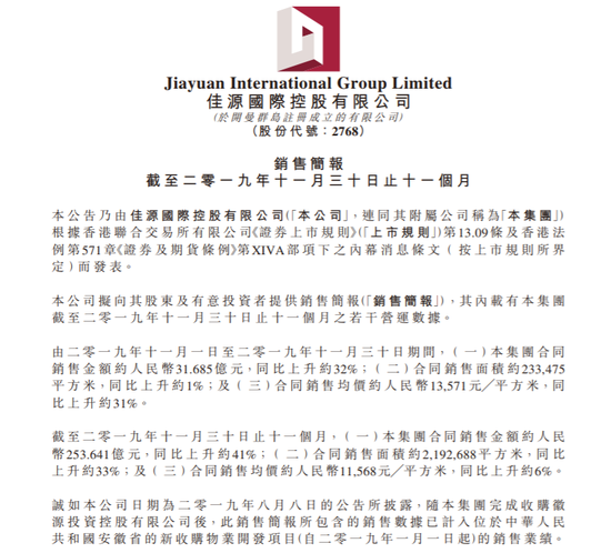 1-11月,该集团合同销售金额约人民币253.641亿元,同比上升约41%;合同销售面积约219.27万平方米,同比上升约33%;及合同销售均价约人民币11568元╱平方米,同比上升约6%