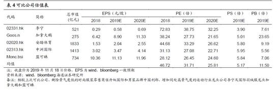 盈利预测与投资建议。我们预计公司2019-2021年归母净利分别为13.02、16.44、21.94亿元,分别同比增长32.71%、26.20%、33.50%,EPS分别为0.12、0.15、0.20元,我们认为1)公司所在中高端羽绒服行业景气度高,公司品牌价值为纺织服装鞋帽行业第一名;2)公司品牌重塑效果显著,预计未来三年羽绒服售价进一步调升,助力毛利率继续上涨,营收、净利增长确定性较高。结合国际羽绒服和服装行业龙头公司估值,我们给予公司2019年25-30倍PE,对应合理价值区间3.00-3.60元/股,按照1港币=0.90元人民币,对应合理价值3.33-4.00港元/股,维持“优大于市”评级。