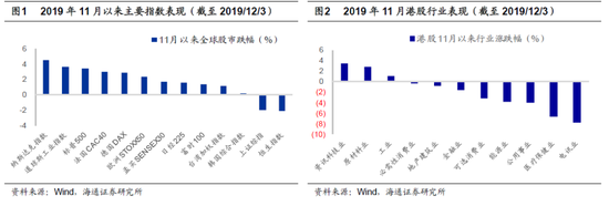 回顾:11月初以来港股再次回撤。10月以来欧美股市再次大涨,美股近期再创历史新高。然而港股从11月初以来再次大幅回撤。11月8日以来(截至19/12/3)恒生指数跌5.3%,并且前期领涨板块也开始回调,如恒生医疗保健指数累计跌8.8%、恒生消费品制造及服务指数累计跌4.3%、恒生互联网科技指数跌5%。11月南下资金净流入规模为289亿,高于10月南下资金190亿,也远高于14年11月以来南下资金月平均净流入额154亿。从行业表现来看,11月份以来涨幅领先的板块是资讯科技(4%),原材料(2.8%),工业(1.5%),跌幅领先的行业主要是医疗保健(7.5%)、电讯业(7.3%)、公用事业(4.2%)。