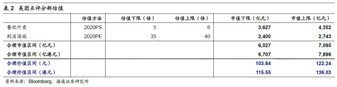 盈利预测与估值。预计基于3Q19美团在收入和盈利能力2方面超预期的表现(此前预期全年GTV、收入各增26%、43%,而1-3Q以上指标各增30%、53%;此前预计经调整EBITDA全年29亿元,经调整EBITDA利润率3.12%;而1-3Q已达到50.8亿元,经调整EBITDA利润率8.6%),我们上调盈利预测:预计2019-2021年净利各5.3亿元、71.6亿元和149.5亿元,经调整EBITDA为56亿元、160亿元和288亿元;给予美团外卖2020年5-6倍PS、到店酒旅2020年35-40倍PE,新业务以0考虑,合计人民币6027-7095亿元,对应6707-7896亿元港币,每股价值合理区间115.55-136.03港元,维持“优于大市”评级。