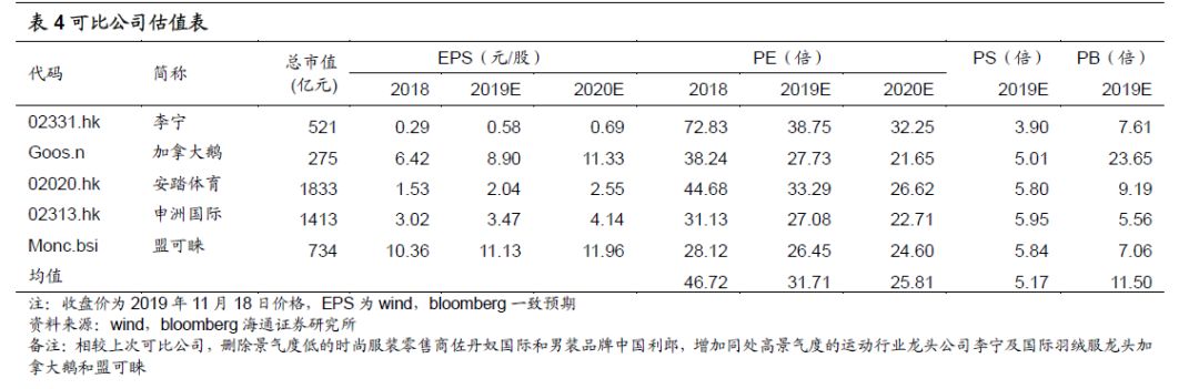 盈利预测与投资建议。我们预计公司2019-2021年归母净利分别为13.02、16.44、21.94亿元,分别同比增长32.71%、26.20%、33.50%,EPS分别为0.12、0.15、0.20元,我们认为1)公司所在中高端羽绒服行业景气度高,公司品牌价值为纺织服装鞋帽行业第一名;2)公司品牌重塑效果显著,预计未来三年羽绒服售价进一步调升,助力毛利率继续上涨,营收、净利增长确定性较高。结合国际羽绒服和服装行业龙头公司估值,我们给予公司2019年25-30倍PE,对应合理价值区间3.00-3.60元/股,按照1港币=0.90元人民币,对应合理价值3.33-4.00港元/股,维持“优大于市”评级。