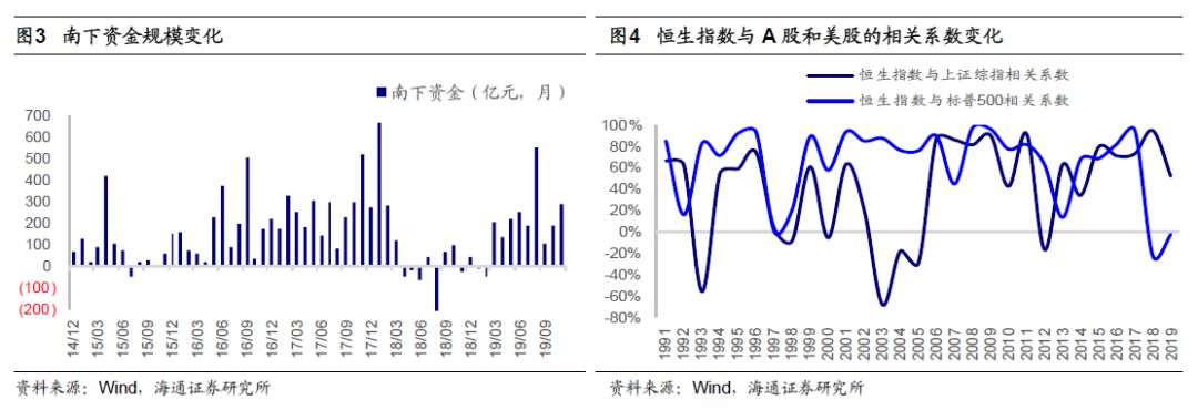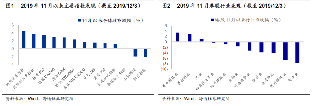 回顾:11月初以来港股再次回撤。10月以来欧美股市再次大涨,美股近期再创历史新高。然而港股从11月初以来再次大幅回撤。11月8日以来(截至19/12/3)恒生指数跌5.3%,并且前期领涨板块也开始回调,如恒生医疗保健指数累计跌8.8%、恒生消费品制造及服务指数累计跌4.3%、恒生互联网科技指数跌5%。11月南下资金净流入规模为289亿,高于10月南下资金190亿,也远高于14年11月以来南下资金月平均净流入额154亿。从行业表现来看,11月份以来涨幅领先的板块是资讯科技(4%),原材料(2.8%),工业(1.5%),跌幅领先的行业主要是医疗保健(7.5%)、电讯业(7.3%)、公用事业(4.2%)。