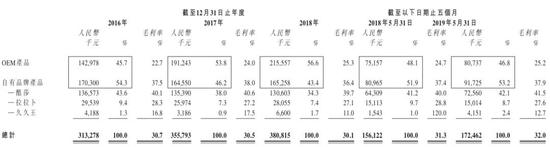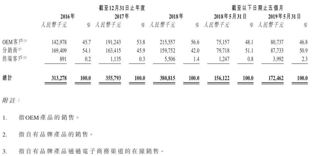 此外,公司主要按批发方式向第三方直接分销商销售公司的自有品牌产品。而在2016-2018年,来自于第三方直接分销商的收益占比分别为54.1%、45.9%及42.0%。