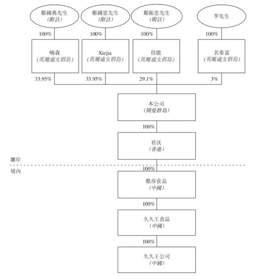 在股权上,久久王为家族集团。招股书说明书显示,郑振忠、郑国思以及郑国典合计持有久久王97%的股份,其中,总裁郑振忠为郑国思以及郑国典的父亲,郑国思和郑国典为胞兄。2019年3月29日,郑振忠、郑国思以及郑国典签署了一致行动书,为一致行动人。