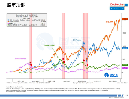 Gundlach分享了自己的“年度图表”,该图表将全球股市分为四个地区(美国、日本、欧洲和新兴市场)。它所显示的是,美国股市正在形成一个令人担忧的市场顶部,类似于上世纪90年代初日经225指数、上世纪90年代末欧元区斯托克50指数以及2007/2008年摩根士丹利新兴市场指数的情况。
