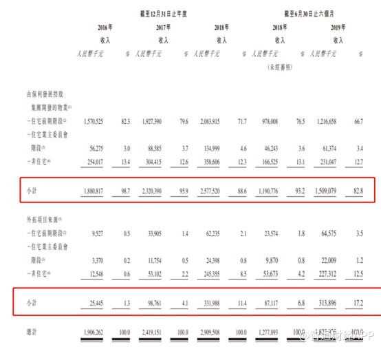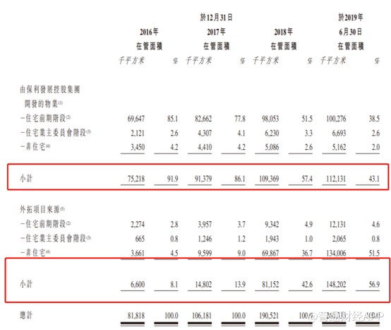 而且据招股书披露,2016年至2019年上半年,由保利地产开发的住宅社区的平均物业管理费分别为2.14元、2.19元、2.21元及2.27元,同期外拓项目收费则为1.19元、1.31元、1.47元及1.48元,仅为保利地产开发项目的65%左右。