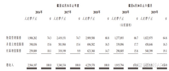 其原因主要是,一是在三个业务中,核心业务物业管理服务的毛利率较低,从2016年至2019年上半年由13.1%升至18.1%,而毛利率最高的社区增值服务毛利率达到45%以上,但是截至2019年6月30日,物业管理服务的收入占比仍然高达65%,社区增值服务只有19.1%。总体毛利率的升高也主要是因为物业管理服务的收入占比逐年降低而社区增值服务收入占比逐渐升高带来的。